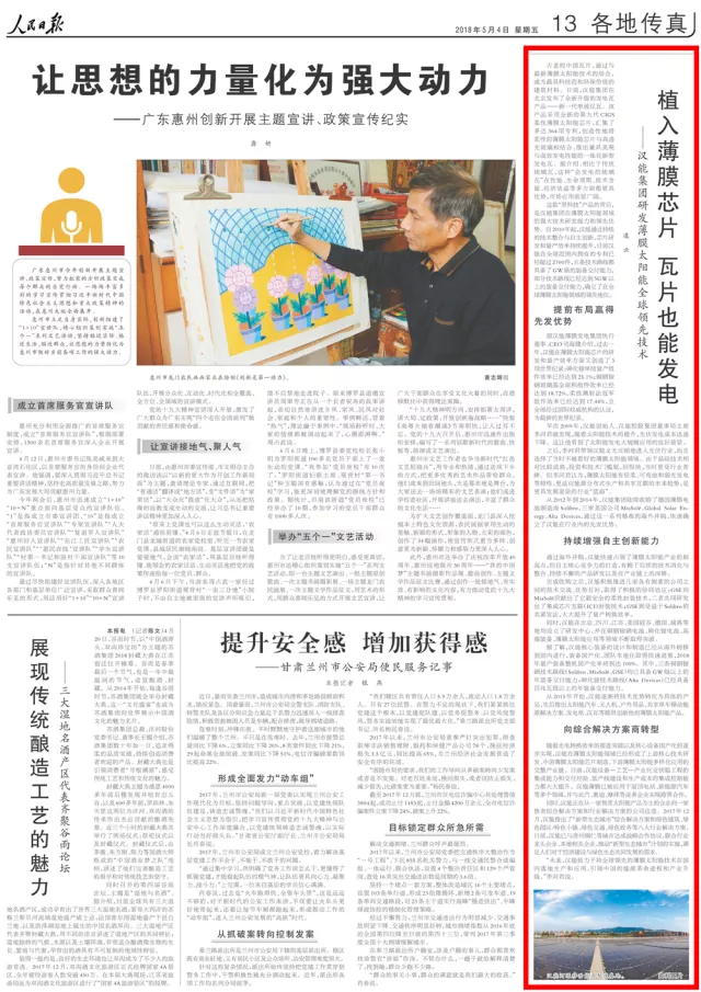 2018年5月4日,《人民日報》第13版配圖報道漢能薄膜太陽能技術,肯定了漢能薄膜太陽能技術的全球領先性,也對以漢瓦為代表的漢能薄膜太陽能產品和生態(tài)城市戰(zhàn)略給予高度評價。報道如下: