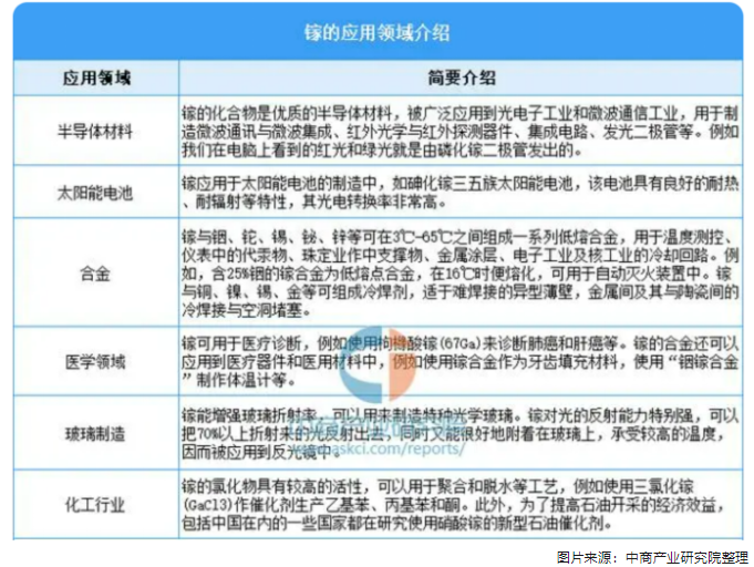 金屬鎵主要以化合物的形式被用于生產(chǎn)半導(dǎo)體、磁材、MO源、光伏材料及熒光粉等,并最終廣泛應(yīng)用于無線通信、化學(xué)工業(yè)、醫(yī)療設(shè)備、太陽能電池和航空航天等眾多領(lǐng)域。從下游應(yīng)用占比情況來看,鎵在半導(dǎo)體、磁材、MO源、光伏材料及熒光粉等領(lǐng)域的應(yīng)用市場份額分別占比42%、29%、9%、8%、7%。