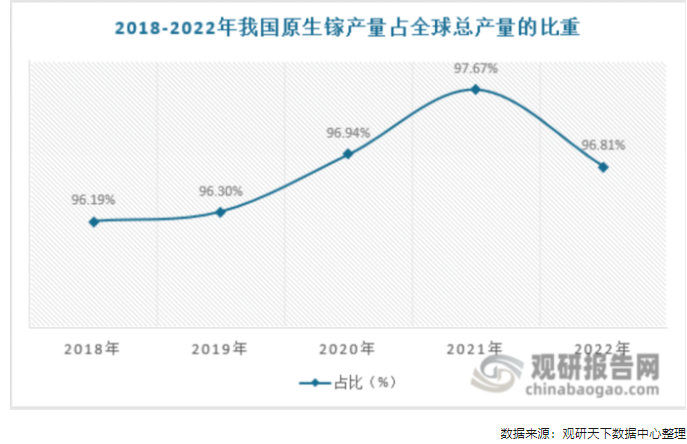 金屬鎵主要來自于氧化鋁的母液,氧化鋁生產(chǎn)過程中提取原生鎵相比其他方式最具備成本優(yōu)勢。另一方面,鎵在其它金屬礦床中的含量極低,經(jīng)過一定富集后也只能達(dá)到幾百克/噸,因而鎵的提取非常困難。另一方面,由于伴生關(guān)系,鎵的產(chǎn)量很難由于鎵價(jià)格上漲而被大幅拉動(dòng),因此,原生鎵的年產(chǎn)量極少。2022年全球原生鎵產(chǎn)量為626噸,其中我國原生鎵產(chǎn)量達(dá)606噸,占比96.81%。