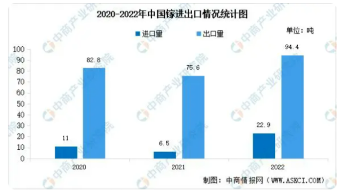 從出口情況來看,中國是全球最大的鎵產(chǎn)品出口國,主要供應(yīng)美國、歐盟、日本和韓國等發(fā)達(dá)經(jīng)濟(jì)體。根據(jù)中國海關(guān)數(shù)據(jù),2022年中國鎵出口量達(dá)94.4噸,為歷年最高。從進(jìn)口情況來看,我國高純鎵生產(chǎn)企業(yè)數(shù)量較少,且以純度不高的5N、6N級(jí)別產(chǎn)品生產(chǎn)為主,7N、8N級(jí)別產(chǎn)品產(chǎn)量低,因此我國高純鎵市場部分需求依靠進(jìn)口,2022年中國鎵進(jìn)口量為22.9噸。