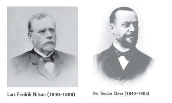 十九世紀(jì)晚期:對(duì)稀土元素的研究成為一股熱潮。在鈧發(fā)現(xiàn)之前一年,瑞士的馬利納克(Marignac)從玫瑰紅色的鉺土中,通過(guò)局部分解硝酸鹽的方式,得到了一種不同于鉺土的白色氧化物,他將這種氧化物命名為鐿土,這就是稀土元素發(fā)現(xiàn)里面的第六名。瑞典烏普薩拉大學(xué)的尼爾森(L.F.Nilson,1840~1899)按照馬利納克的方法將鉺土提純,并精確測(cè)量鉺和鐿的原子量(因?yàn)樗@個(gè)時(shí)候正在專(zhuān)注于精確測(cè)量稀土元素的物理與化學(xué)常數(shù)以期對(duì)元素周期律作出驗(yàn)證)。當(dāng)他經(jīng)過(guò)13次局部分解之后,得到了3.5g純凈的鐿土。但是這時(shí)候奇怪的事情發(fā)生了,馬利納克給出的鐿的原子量是172.5,而尼爾森得到的則只有167.46。尼爾森敏銳地意識(shí)到這里面有可能是什么輕質(zhì)的元素。于是他將得到的鐿土又用相同的流程繼續(xù)處理,最后當(dāng)只剩下十分之一樣品的時(shí)候,測(cè)得的原子量更是掉到了134.75;同時(shí)光譜中還發(fā)現(xiàn)了一些新的吸收線。尼爾森用他的故鄉(xiāng)斯堪的納維亞半島給鈧命名為Scandium。
